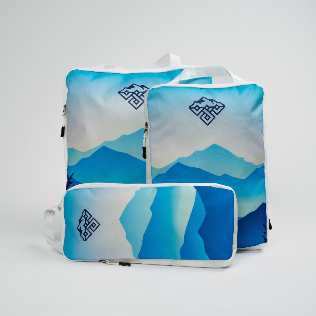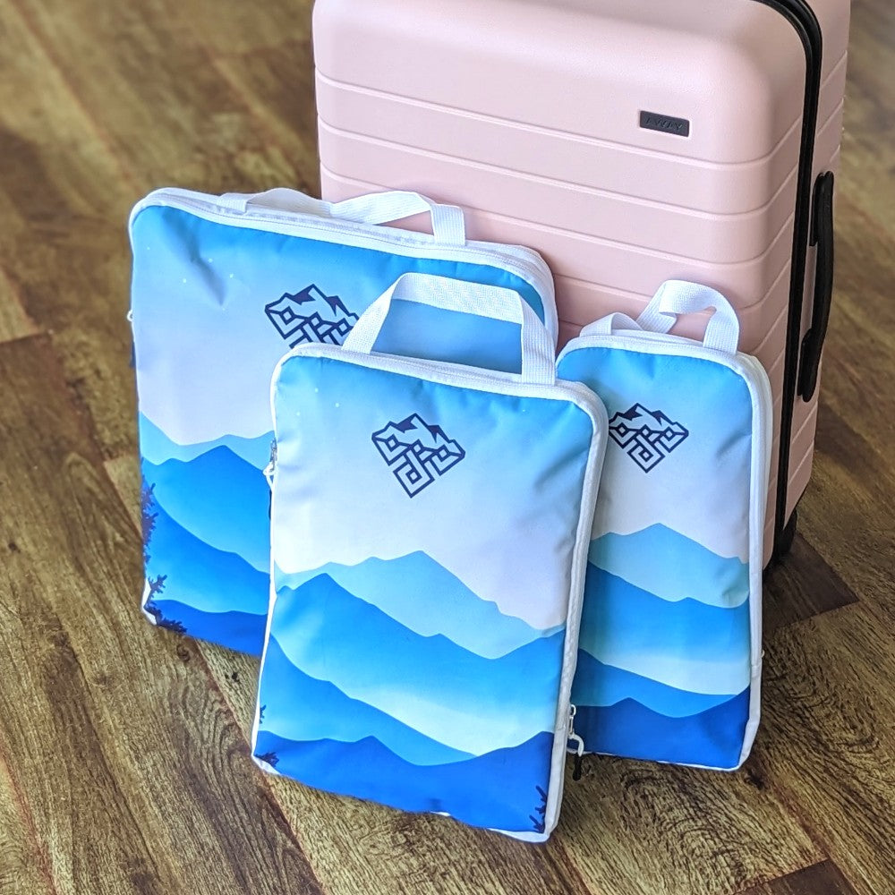 Organise your adventures with this set of packing cubes. Featuring the misty mountain blue design. Load up your gear and use the second zip to compress the cube so you save valuable space when packing for your next adventure.